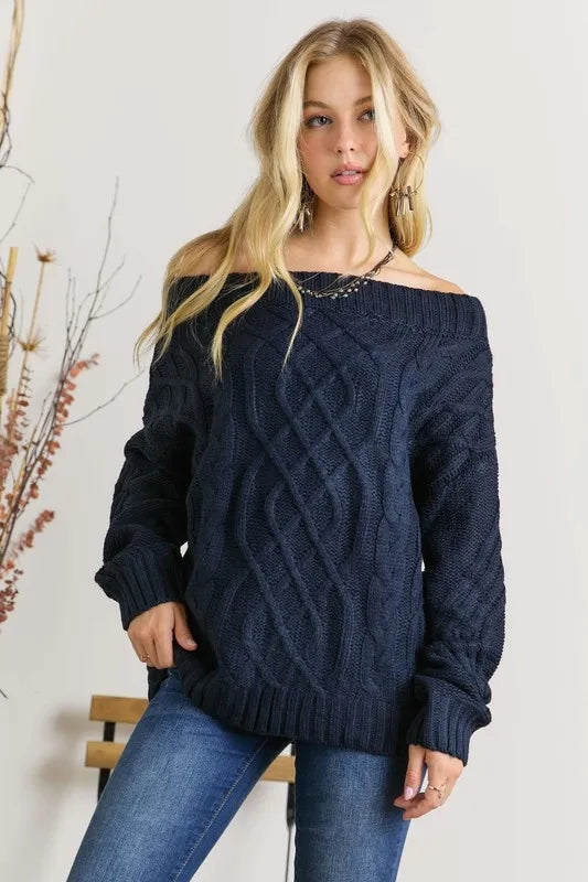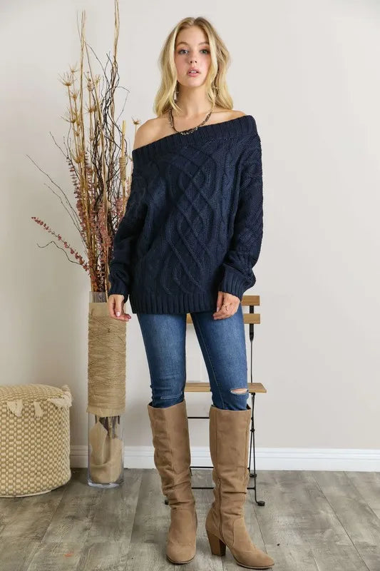 The Cable Knit Off Shoulder Sweater is a cozy and stylish piece featuring a classic cable knit pattern and an off-the-shoulder design. This sweater offers a trendy and feminine look while keeping you warm and comfortable. Perfect for layering or wearing on its own, this sweater is a versatile addition to your wardrobe for cooler weather.