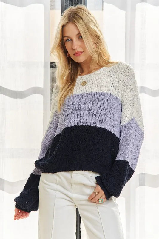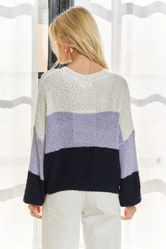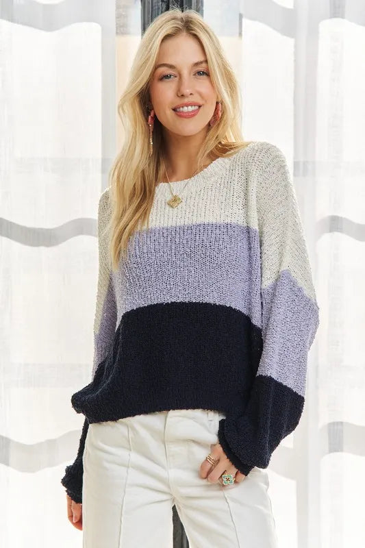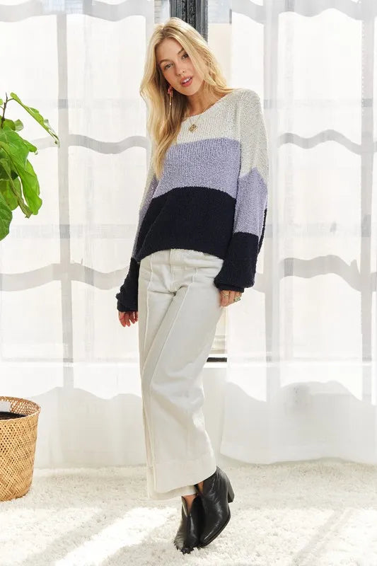 This comfy sweater showcases a stylish color block design for a trendy and eye-catching look. The color block pattern adds a modern and playful twist to the classic sweater silhouette, making it a versatile and fashion-forward piece. Perfect for staying cozy and chic, this color block sweater is a must-have for adding a pop of personality to your cold-weather wardrobe.