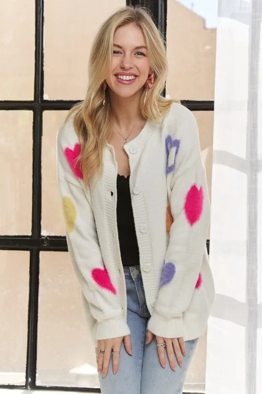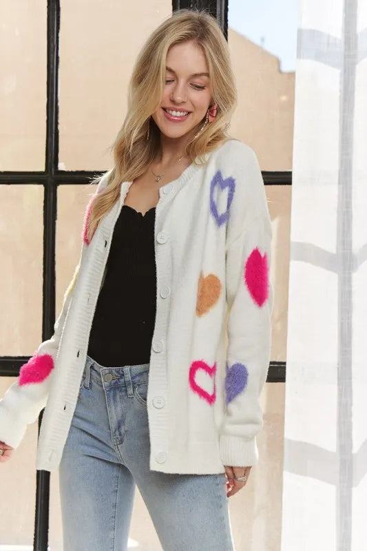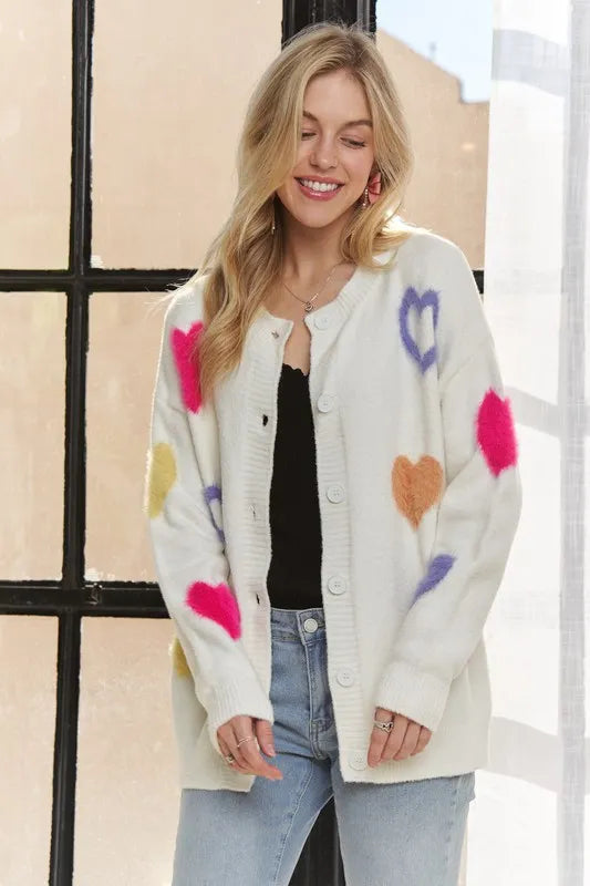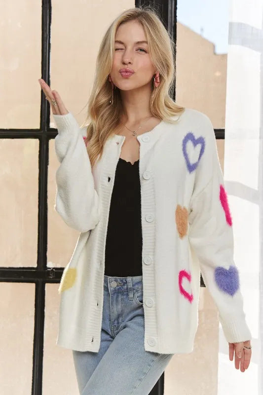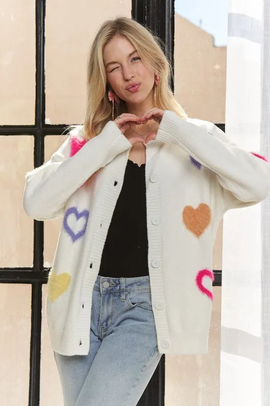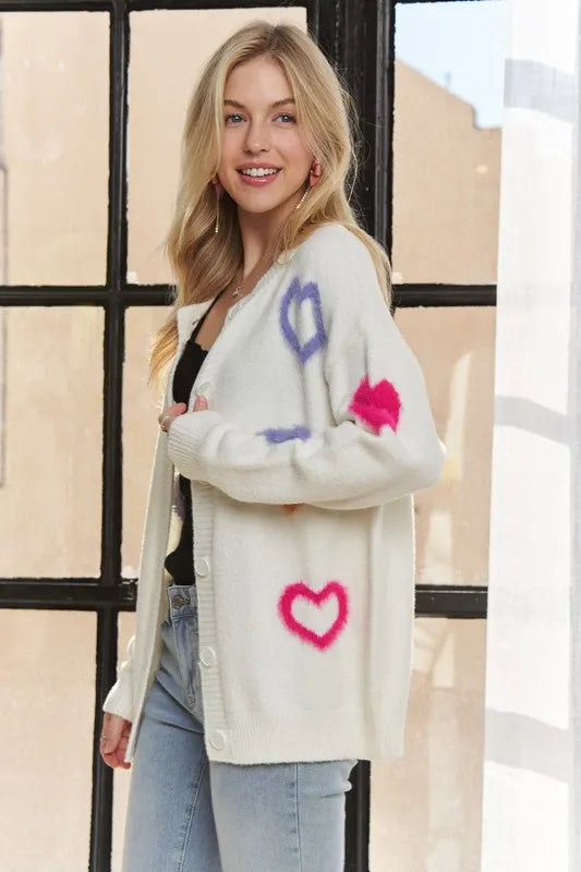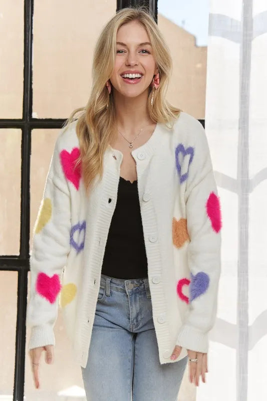 The fluffy heart fuzzy sweater cardigan is a cozy and whimsical addition to your winter wardrobe. With its soft texture and cute heart design, it adds a playful touch to your outfit. Pair it with jeans or leggings for a cute and comfy look all season long.