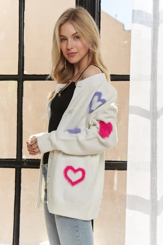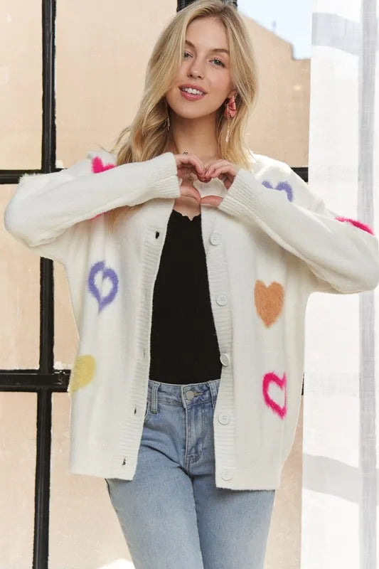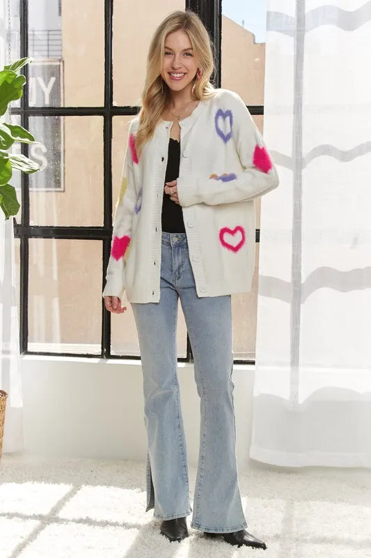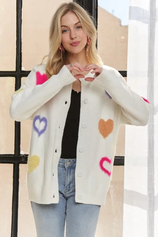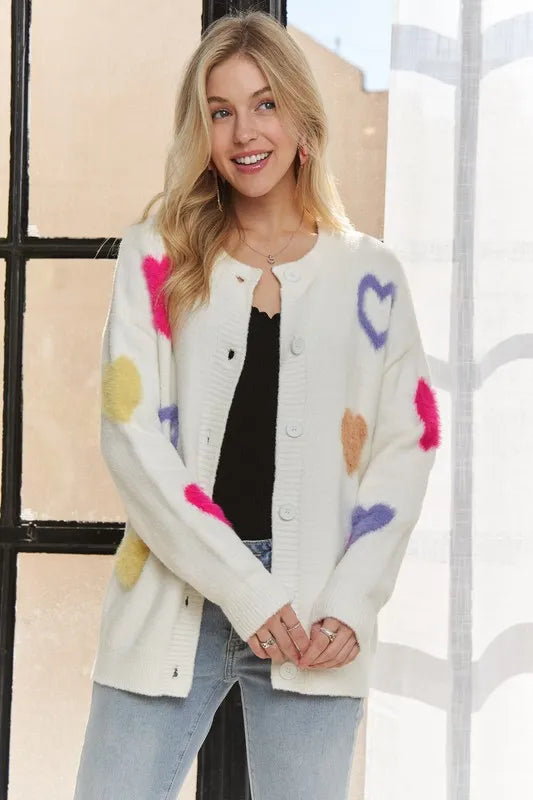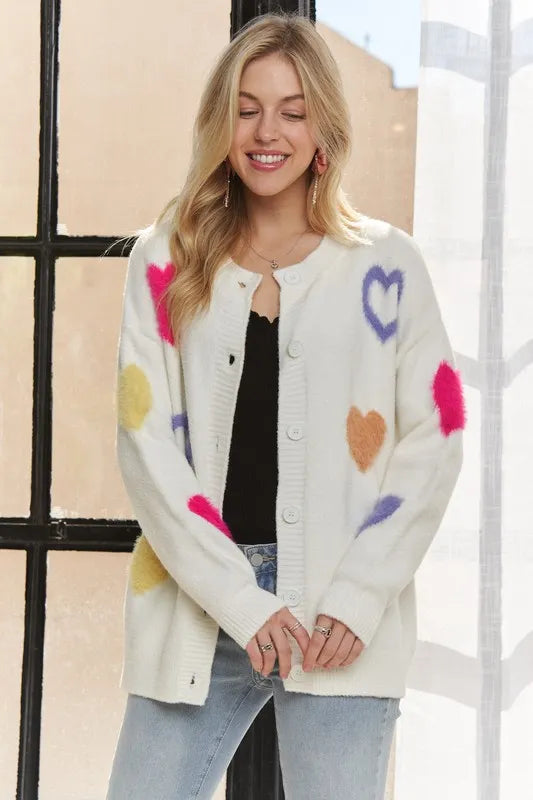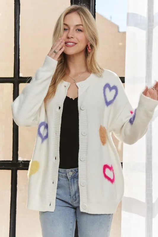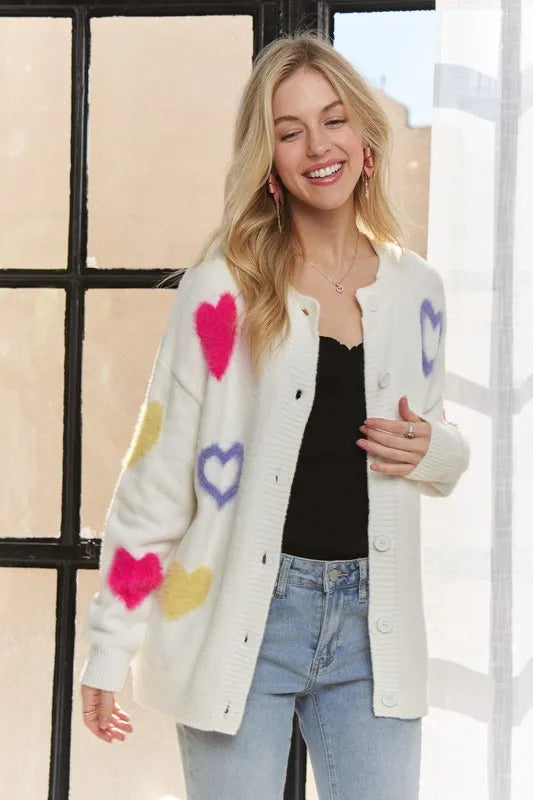 The fluffy heart fuzzy sweater cardigan is a cozy and whimsical addition to your winter wardrobe. With its soft texture and cute heart design, it adds a playful touch to your outfit. Pair it with jeans or leggings for a cute and comfy look all season long.