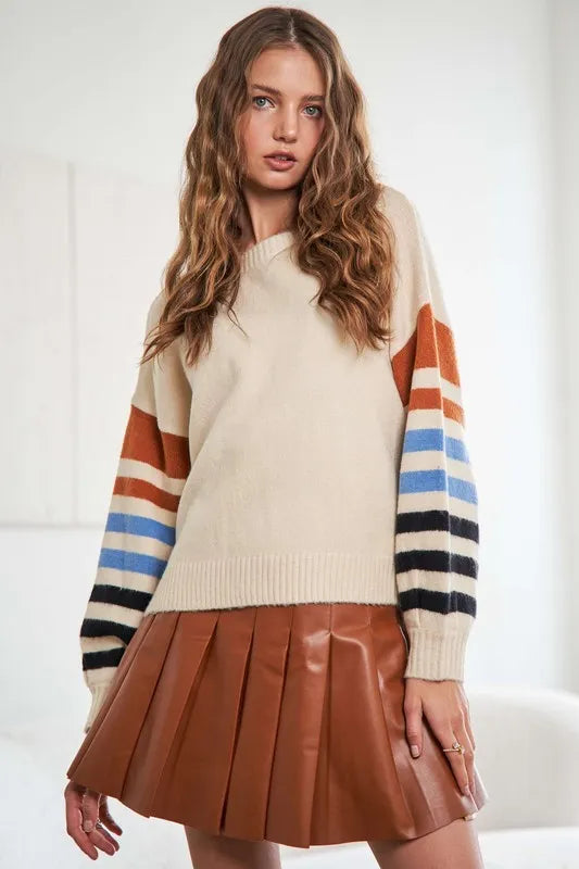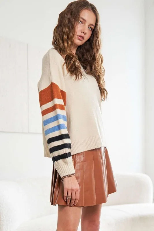 Stay warm and stylish in this cozy sweater with striped sleeves. The perfect piece to elevate your winter wardrobe. Made from soft and comfortable material for all-day comfort. Pair it with your favorite jeans or leggings for a casual yet chic look. Add a pop of color to your outfit with this trendy sweater.