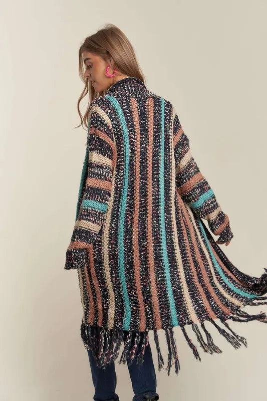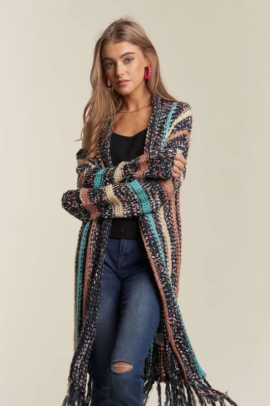 The multi-color sweater long cardigan with fringes is a trendy and eye-catching layering piece. With its colorful design and fun fringe details, this cardigan adds a touch of bohemian flair to your look. The longer length provides added warmth and coverage, making it perfect for cooler weather. Pair it with jeans and a basic top for a stylish and cozy ensemble that exudes a playful charm.