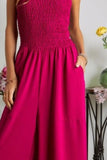 The Smocking Top Wide Leg Jumpsuit combines style and comfort effortlessly. The smocked top provides a fitted and flattering look, while the wide-leg design offers a chic and relaxed silhouette. This jumpsuit is a versatile choice for any occasion, whether it's a casual day out or a special event. Effortlessly stylish and easy to wear, this jumpsuit is a must-have in any wardrobe.