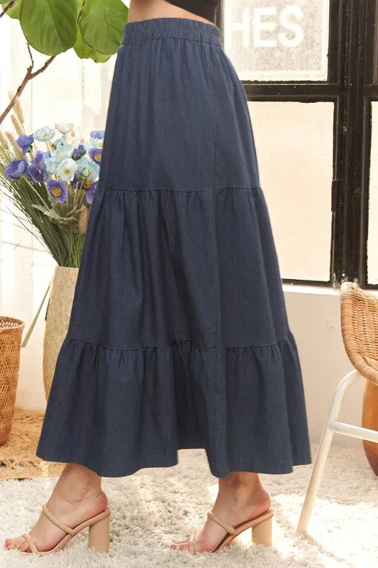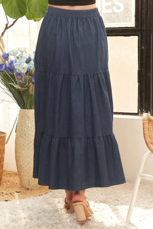This Waist Band Tiered Denim Maxi Skirt features a flattering high waistband and stylish tiered design. Made from denim fabric, it offers both comfort and durability. The maxi length adds a touch of elegance to any outfit, making it a versatile wardrobe staple.