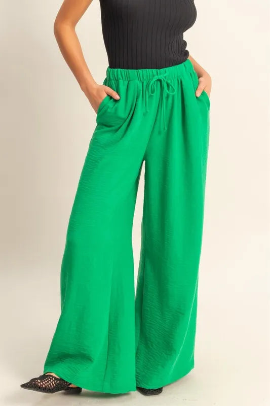 Achieve a chic and comfortable look with these elasticized waist wide leg pants. The elasticized waistband provides a flexible and easy fit for all-day comfort. The wide leg silhouette offers a stylish and on-trend look that is perfect for both casual and dressed-up occasions. Pair these pants with a tucked-in blouse and heels for a polished outfit, or with a basic tee and sneakers for a more relaxed vibe. Elevate your style with these versatile and flattering pants.