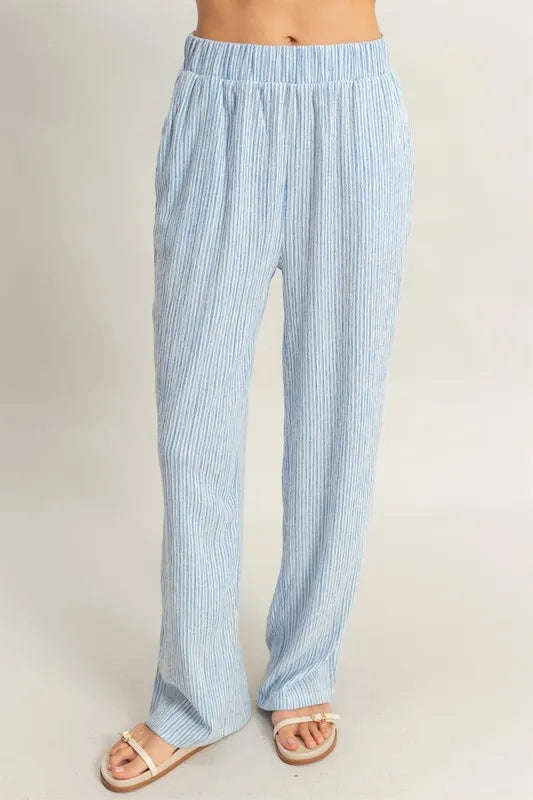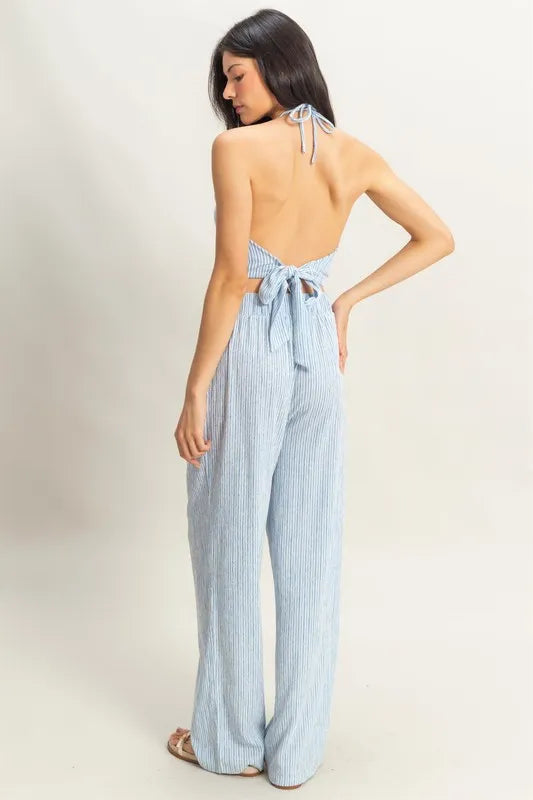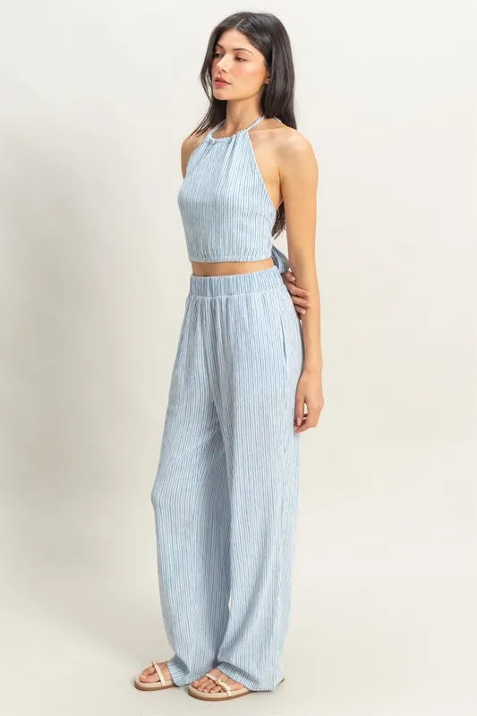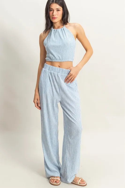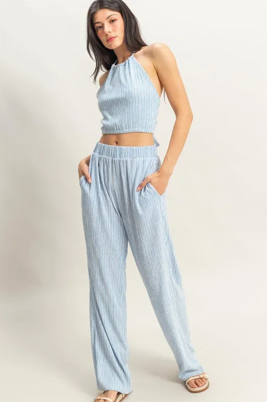 This set includes a stylish and versatile striped halter neck top paired with matching pants. The halter neck design adds a touch of sophistication, while the striped pattern adds a playful element to the ensemble. Perfect for various occasions, this set is a chic and effortless choice for a fashionable look.