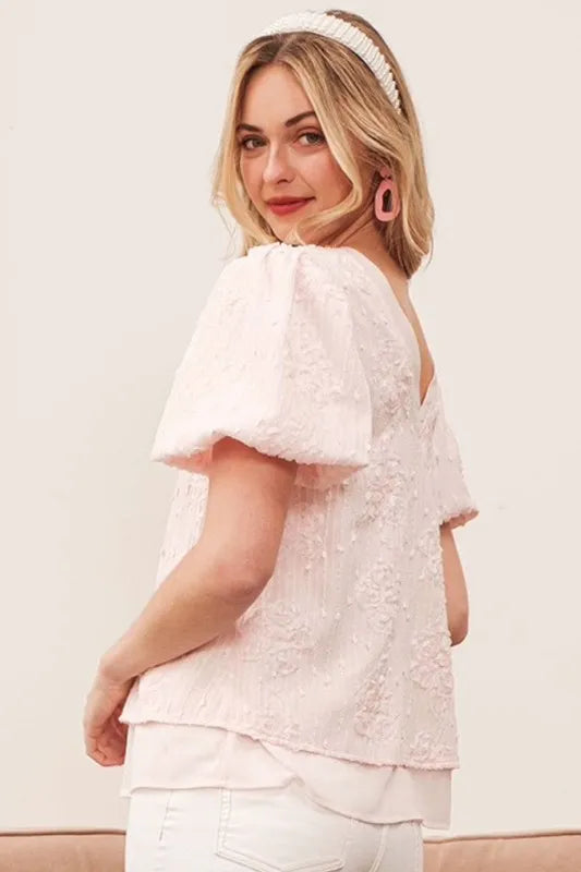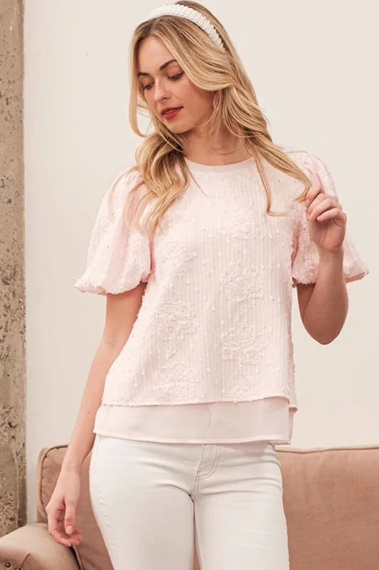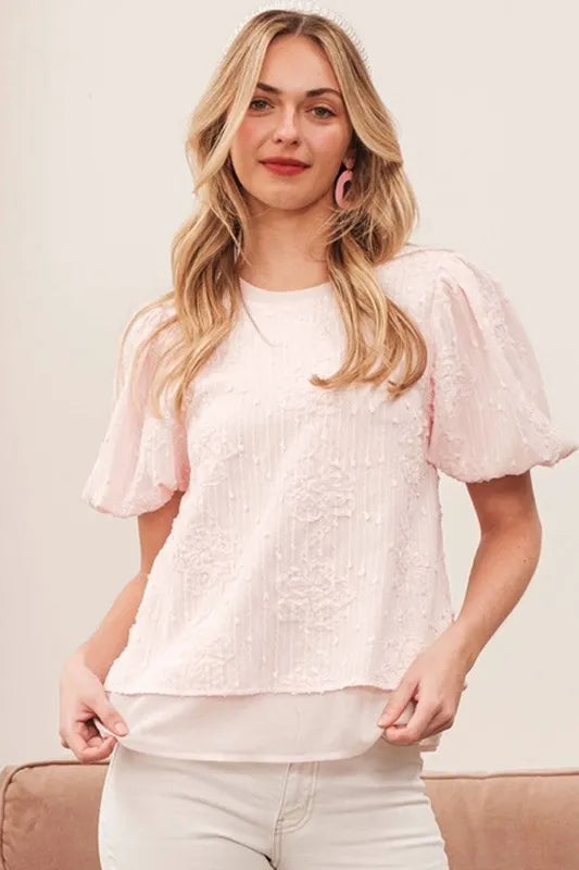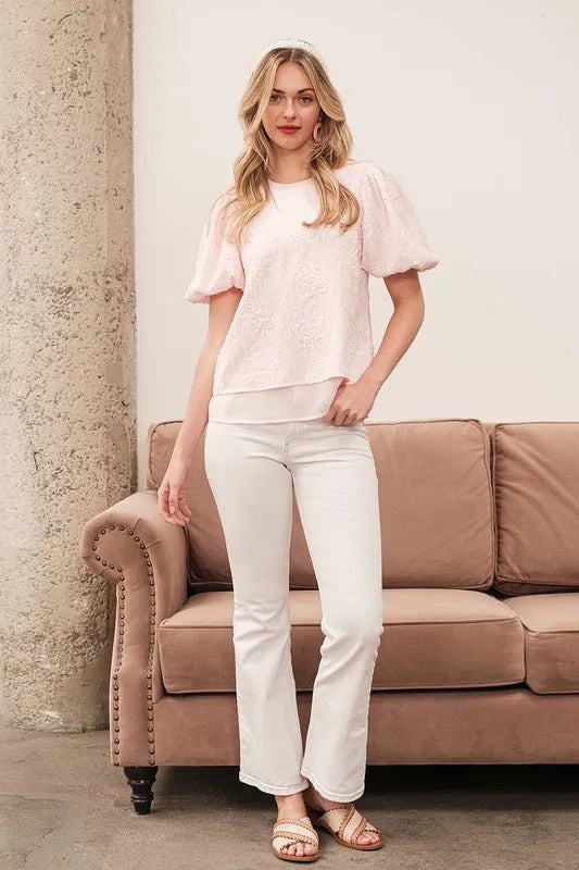 Add a touch of romantic charm to your outfit with this floral textured puff sleeve top. The floral detailing gives it a feminine and elegant look. The puff sleeves add a stylish and eye-catching element. Perfect for dressing up a casual outfit or adding flair to a work ensemble. Pair with jeans or a skirt for a versatile and chic look. Embrace a trendy and sophisticated style with this gorgeous top.