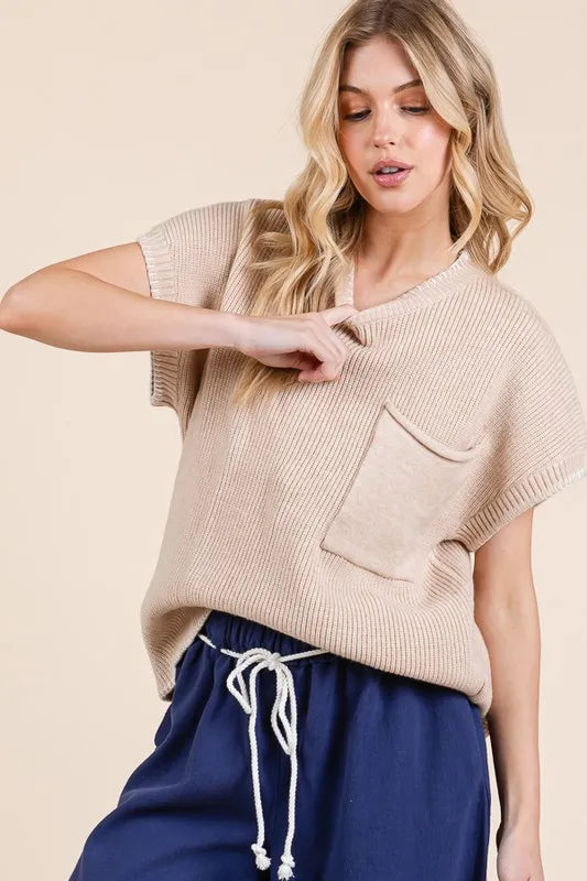 Stay stylish and cozy in this solid cap sleeve stitch edge knit sweater. The cap sleeves add a unique and modern touch to the classic sweater design. The stitch edge detailing gives it a chic and textured look. Perfect for layering or wearing on its own for a fashionable outfit. Elevate your winter wardrobe with this versatile and stylish knit sweater.