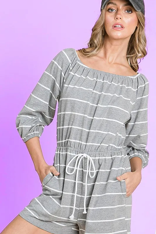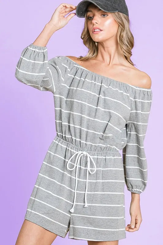 Show off your shoulders in style with this off-the-shoulder quarter sleeve romper featuring stripes. The striped pattern adds a classic and chic touch to the romper. The off-the-shoulder neckline is trendy and flattering. The quarter sleeves provide a stylish and comfortable look. Perfect for a day out or a casual summer gathering. Embrace a fashion-forward style with this versatile and eye-catching romper.