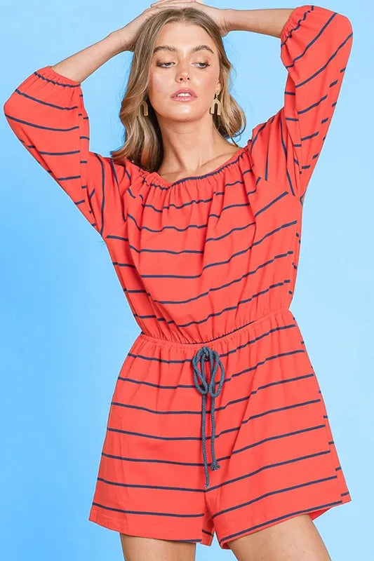 Show off your shoulders in style with this off-the-shoulder quarter sleeve romper featuring stripes. The striped pattern adds a classic and chic touch to the romper. The off-the-shoulder neckline is trendy and flattering. The quarter sleeves provide a stylish and comfortable look. Perfect for a day out or a casual summer gathering. Embrace a fashion-forward style with this versatile and eye-catching romper.