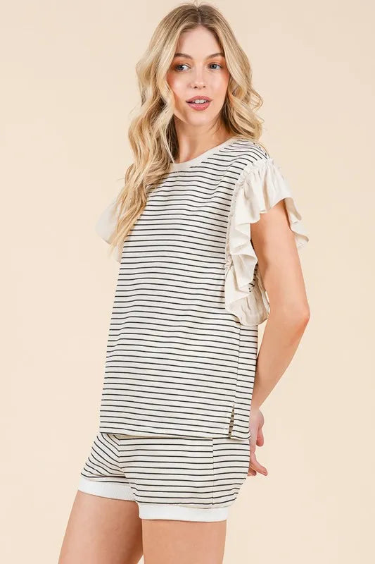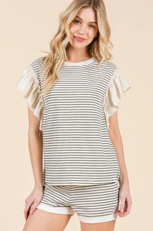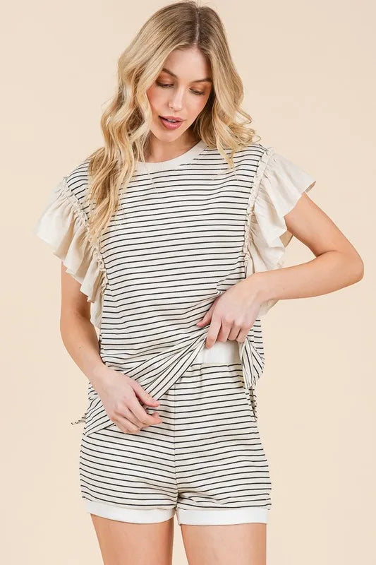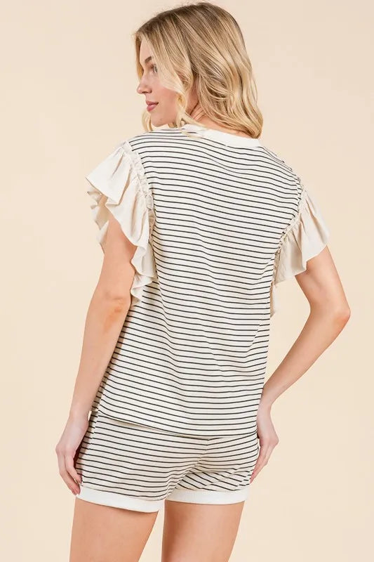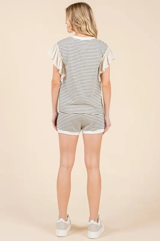 Get ready for summer in style with this matching set featuring a striped ruffle sleeve round neck top and shorts. The ruffle sleeve detailing adds a playful and feminine touch to the top. The striped pattern creates a fun and trendy look for the season. Perfect for a coordinated and fashionable outfit that's both comfortable and chic. Stay cool and on-trend with this versatile top and shorts set.