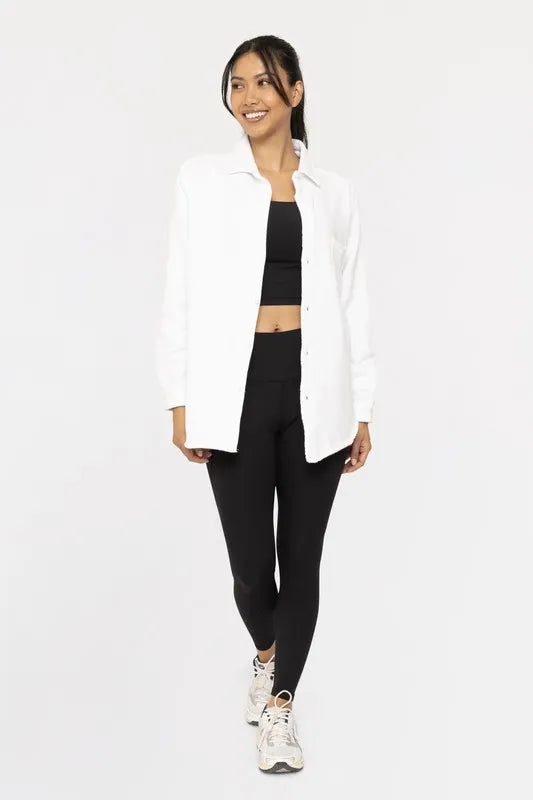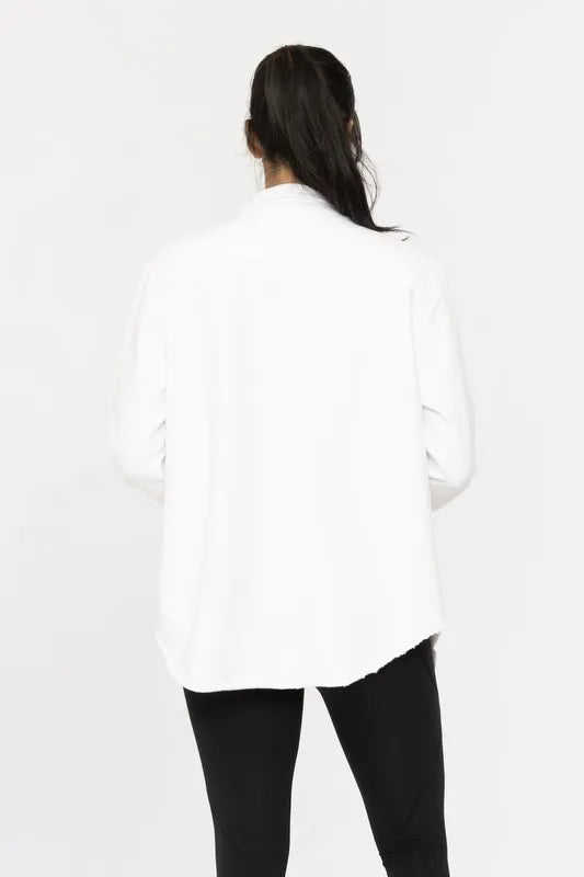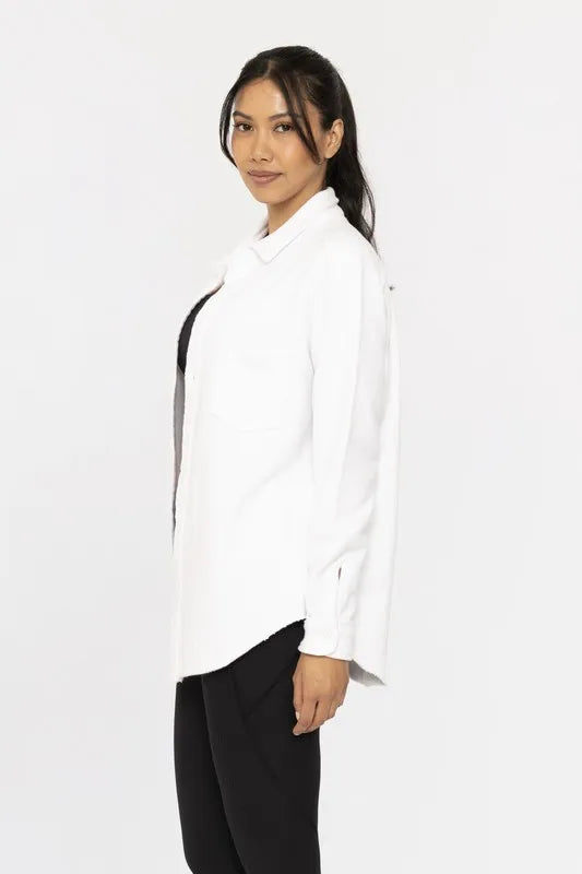 The Raw Edge Cotton Button Down Shacket is a versatile and on-trend piece that combines the style of a shirt with the comfort of a jacket. The raw edge detailing adds a casual and edgy touch to the garment. With its button-down front, this shacket can be worn open as a layering piece or buttoned up as a standalone top. Made from soft cotton, it offers both warmth and breathability. Perfect for adding an effortless and stylish layer to your outfit, the Raw Edge Cotton Button Down Shacket is a must-have for a chic and functional wardrobe.