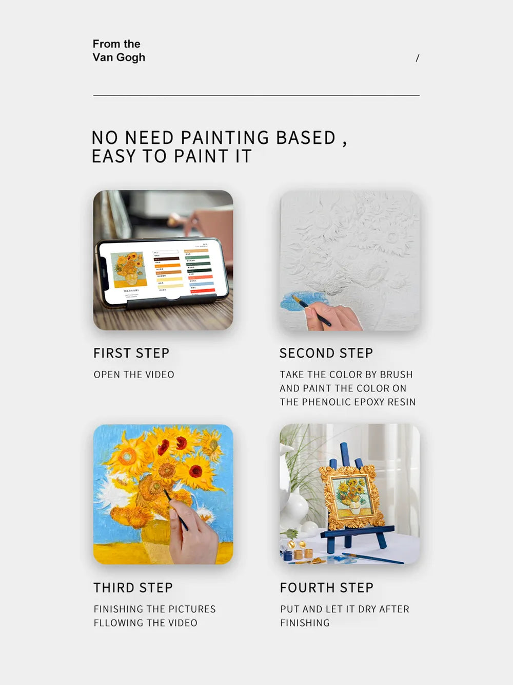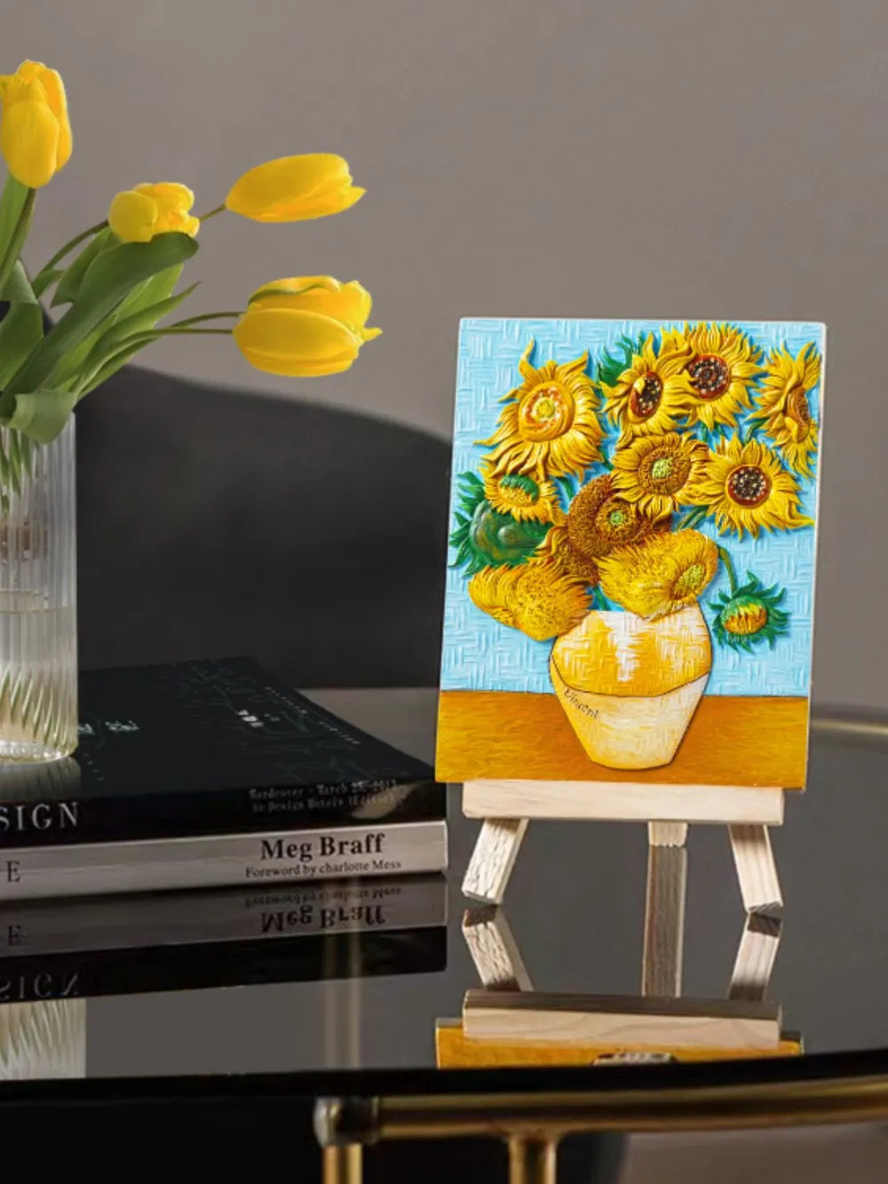 A Van Gogh's Sunflowers DIY 3D oil painting kit is a creative and artistic project inspired by Vincent van Gogh's famous series of sunflower paintings. This kit typically includes a canvas with a pre-printed outline of the sunflowers, oil paints, brushes, and instructions for painting the artwork. The 3D aspect of the painting might involve adding texture or layering the paint to create a sense of depth and dimension to the sunflowers. By following the instructions and using the materials provided in the kit, you can recreate Van Gogh's masterpiece in your own style and enjoy a fun and immersive painting experience. It's a great way to unleash your creativity and create a beautiful piece of art to display in your home.