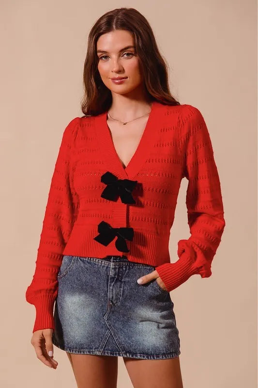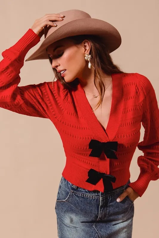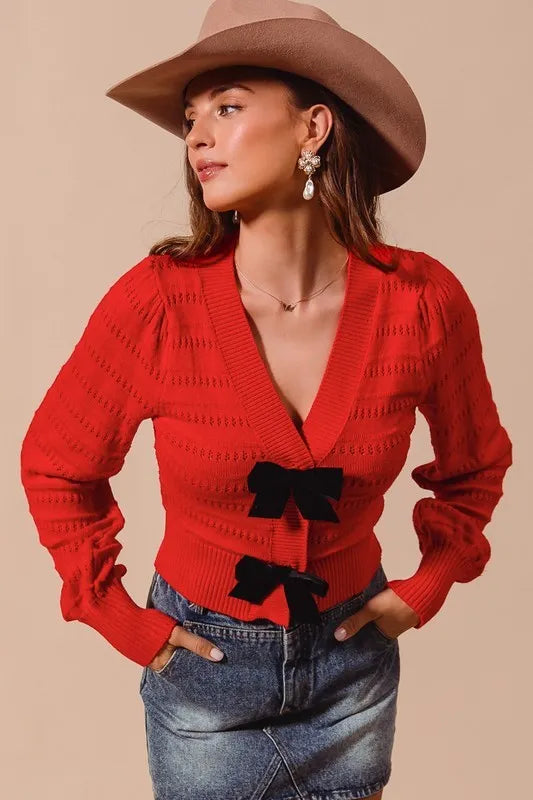 The Contrast Bow Front Sweater Cardigan is a charming and feminine piece for your wardrobe. The contrast bow detail in the front adds a sweet and playful touch to the cardigan. Made from cozy sweater material, it provides warmth and comfort. Perfect for layering over tops or dresses, this cardigan adds a stylish and refined look to any outfit. Pair it with a skirt or trousers for a chic and sophisticated ensemble!