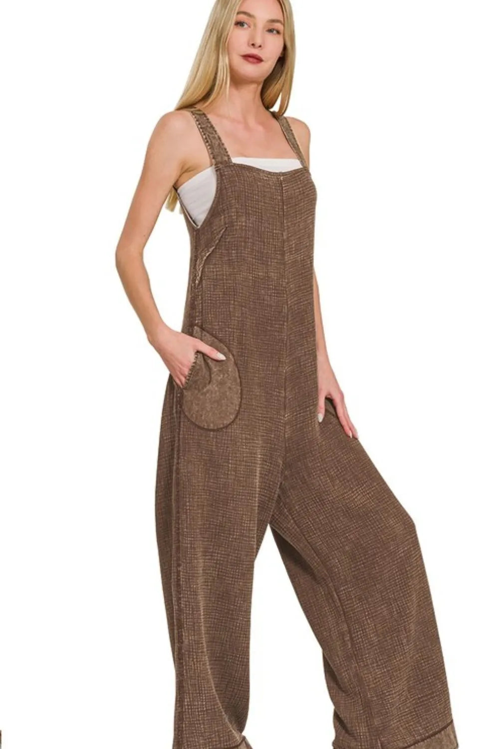 Double gauze washed wide leg overalls are a stylish and comfortable clothing option that combines a trendy silhouette with a soft and breathable fabric. The double gauze material has a lightweight and airy feel, making it perfect for warmer weather. The washed finish gives the overalls a relaxed and slightly worn-in look that adds to their charm. The wide leg design adds a fashionable touch, and the overalls can be styled in various ways for a casual and chic outfit. Pair them with a simple t-shirt or tank top underneath and accessorize with sneakers or sandals for a laid-back and effortless look. These overalls are versatile and can be worn for various occasions, from running errands to a casual day out with friends.