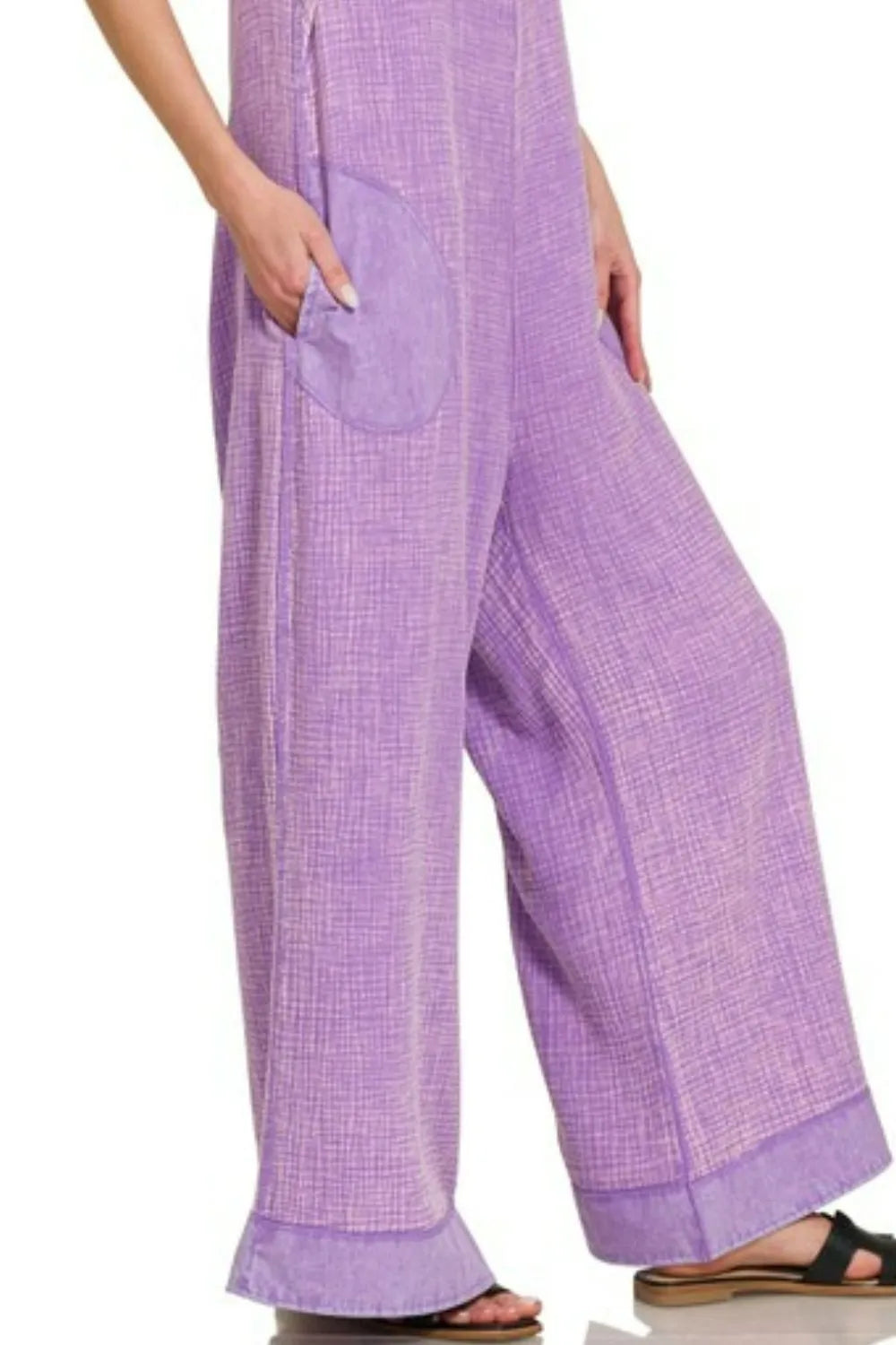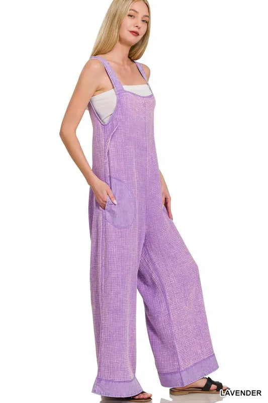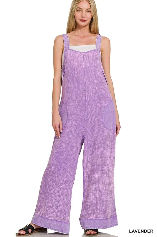 Double gauze washed wide leg overalls are a stylish and comfortable clothing option that combines a trendy silhouette with a soft and breathable fabric. The double gauze material has a lightweight and airy feel, making it perfect for warmer weather. The washed finish gives the overalls a relaxed and slightly worn-in look that adds to their charm. The wide leg design adds a fashionable touch, and the overalls can be styled in various ways for a casual and chic outfit. Pair them with a simple t-shirt or tank top underneath and accessorize with sneakers or sandals for a laid-back and effortless look. These overalls are versatile and can be worn for various occasions, from running errands to a casual day out with friends.