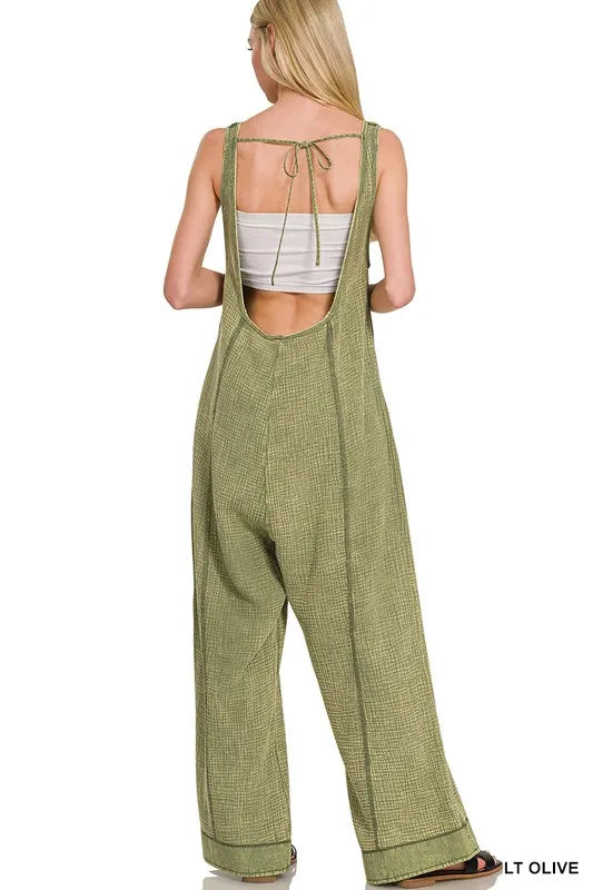 Double gauze washed wide leg overalls are a stylish and comfortable clothing option that combines a trendy silhouette with a soft and breathable fabric. The double gauze material has a lightweight and airy feel, making it perfect for warmer weather. The washed finish gives the overalls a relaxed and slightly worn-in look that adds to their charm. The wide leg design adds a fashionable touch, and the overalls can be styled in various ways for a casual and chic outfit. Pair them with a simple t-shirt or tank top underneath and accessorize with sneakers or sandals for a laid-back and effortless look. These overalls are versatile and can be worn for various occasions, from running errands to a casual day out with friends.