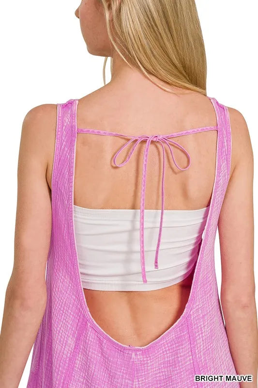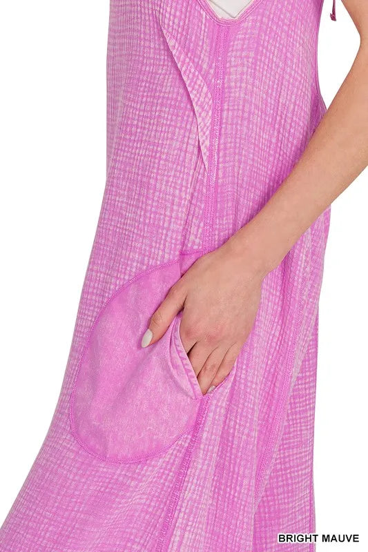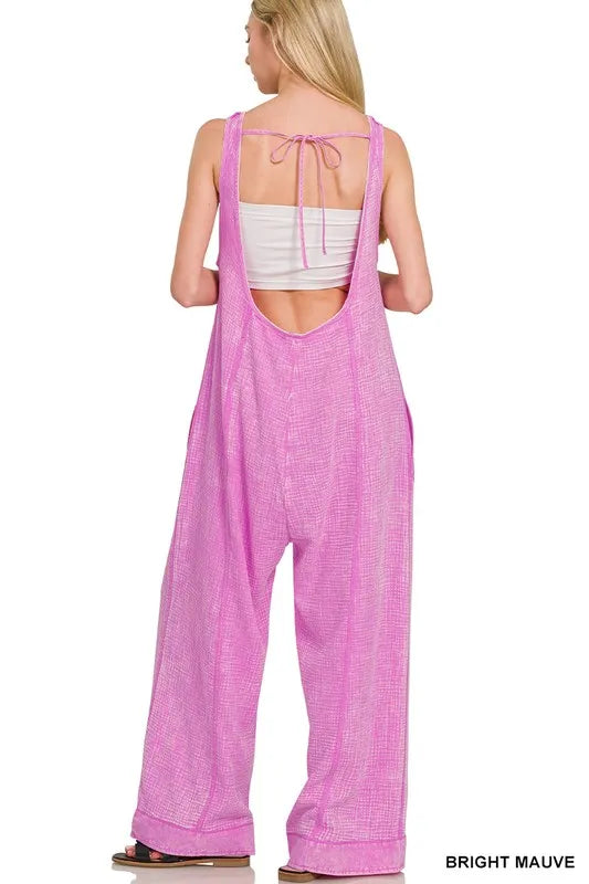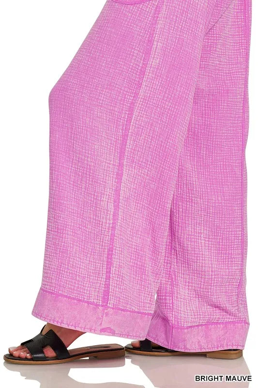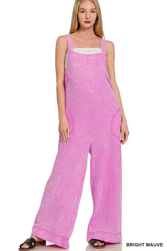 Double gauze washed wide leg overalls are a stylish and comfortable clothing option that combines a trendy silhouette with a soft and breathable fabric. The double gauze material has a lightweight and airy feel, making it perfect for warmer weather. The washed finish gives the overalls a relaxed and slightly worn-in look that adds to their charm. The wide leg design adds a fashionable touch, and the overalls can be styled in various ways for a casual and chic outfit. Pair them with a simple t-shirt or tank top underneath and accessorize with sneakers or sandals for a laid-back and effortless look. These overalls are versatile and can be worn for various occasions, from running errands to a casual day out with friends.