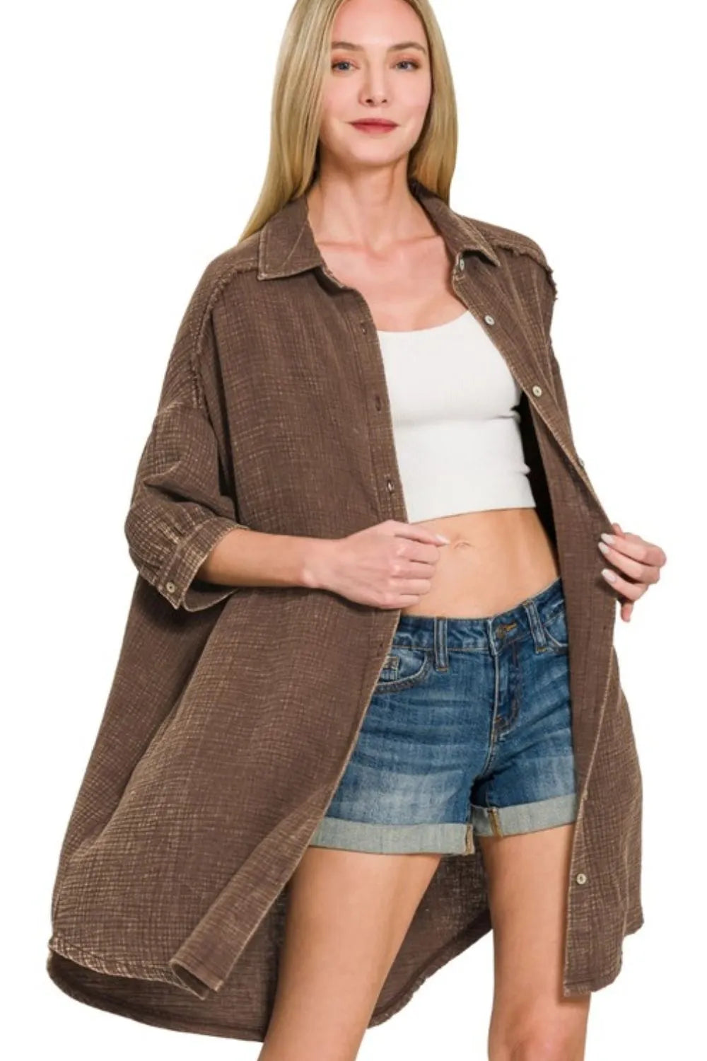 Zenana Washed Double Gauze Button Down Shirt Dress